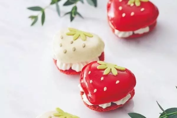 「アトリエ ドゥ ゴディバ」のホワイトデー&スプリングシーズン限定スイーツの中でも注目は、コロンとしたいちご型フォルムが愛らしい「苺のマカロン」。赤や白のマカロン生地で、フレッシュ苺や、いちごを煮詰めたコンポートを挟んでいる。