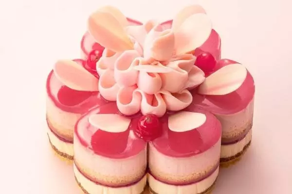 天面には、フランボアのナパージュに、ピンクのホイップクリームをフリルのように重ねた。さらに、食感の良いグロゼイユと、花びらチョコレートをデコレーションしている。