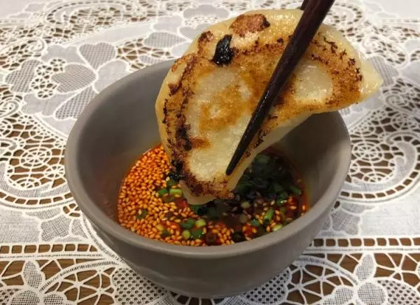 そして、2段活用目の「餃子」をたれにつけます。もちもちの皮の中からは肉汁がたっぷりとあふれ出し、その肉汁とたれが混ざり合い、もう一段階旨さが増します