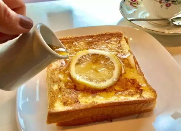 私の狙いは、この「フレンチトースト」。トーストが2枚重ねられ、中央にはレモンスライスが1枚、ちょこんとのっています。生クリームたっぷりのパンケーキとは一線を画す、ほんのり酸味が漂うさっぱりとした味わい。セットの珈琲は深煎りで、パンケーキとの相性も抜群です。このセットが税込みで750円なのも下町の良心のなせる業、ですよね。
