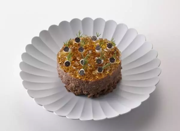 盛付例:パテの上にコンソメジュレとお好みでホイップクリームや香草をトッピング