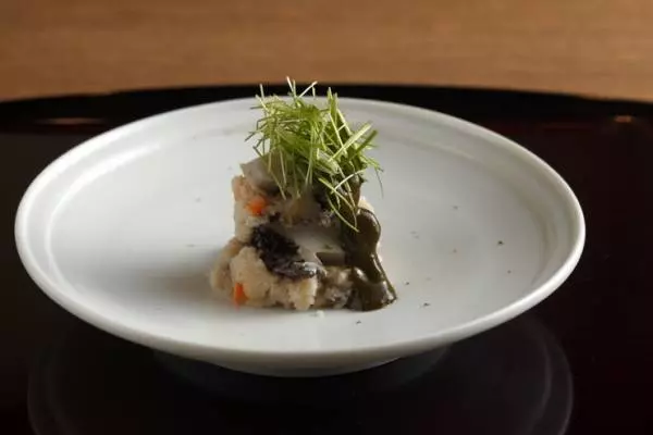 松茸の風味、きのこならではの野趣をダイレクトに伝えることを意識した炊き合わせ。大ぶりにカットした松茸と、鴨のだしの絶妙な取り合わせで、豊かな香りと深い味わいが伝わります。