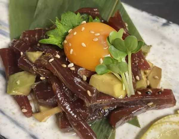 藤沢駅から徒歩3分のところにある、旬を贅沢に盛り込んだ季節料理を提供する【舞桜】では、豊洲仲卸大宗から仕入れたマグロをつかった『マグロとアボカドのユッケ』を提供。濃い旨味にお酒が進みつつも、卵黄でクリーミーに包んでくれるのでお子さまでも食べやすく、老若男女が楽しめるメニューです。
