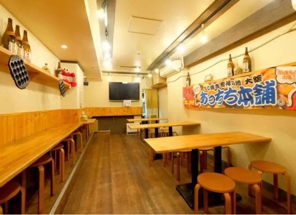 「なんば」駅を降りて歩くこと5分、道頓堀川を渡ってすぐ左側にある【あっちち本舗 道頓堀店】。外はカリカリ、中はトロトロ、熱々のできたてたこ焼きが味わえるお店です。数あるこだわりの中でも最も重きを置いているのが「タコ」と「鉄板」。タコは冷凍のものを一切使わず、生のもののみを使用しています。