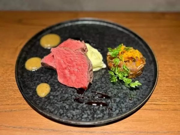 A5等級の鹿児島県産黒毛和牛のランプまたはイチボを低温で調理し、ミディアムレアに仕上げます。付け合わせには塩昆布を使った特製ソースなどをご用意し、様々な味わいの変化が楽しめます。