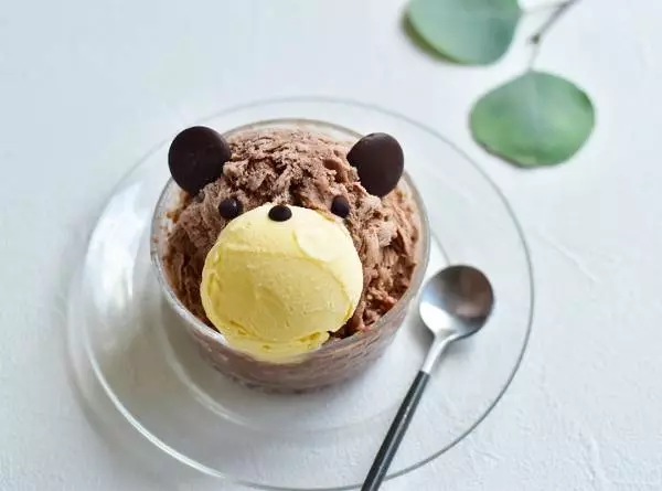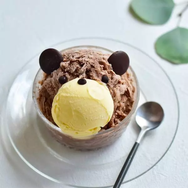 つぶらな瞳がキュートな、クマさんのかき氷が出来上がり! みんなが大好きな濃厚なチョコレートのかき氷で、夏休みのお家時間をハッピーに♪