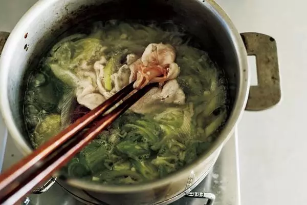 豚肉は、しゃぶしゃぶ程度にさっと煮ることで、肉が固くなるのを防ぐ。