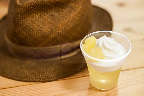 レモンスカッシュフロートをイメージしたゼリーで、レモン味のゼリーの上に、クラッシュゼリーとレモンムースを重ねて、ホイップクリームとパイナップル果肉を2つトッピングしたものです。