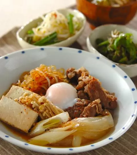 甘辛味の肉豆腐は、温泉卵をからめて召し上がれ! 副菜にも野菜をたっぷり入れて野菜不足解消!