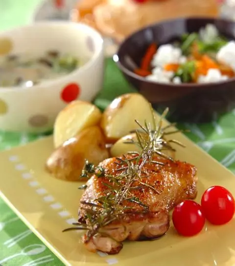 ローズマリーやタイムのハーブがほんのり香るチキンは、カリッとしておいしいです。ブロッコリーがたっぷり入ったスープと一緒にどうぞ。