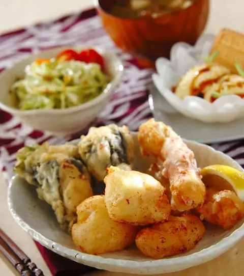 今日の献立は「ホタテとチーズの天ぷら」を含めた全4品。