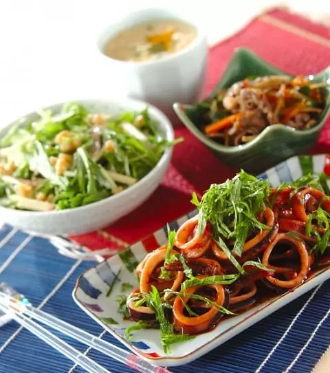 今日の献立は「イカのジンジャー照り焼き」を含めた全4品。