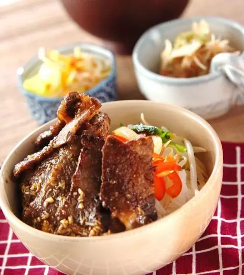 メインはがっつりボリューム満点! カルビ丼! 副菜はサッパリおいしい和え物。