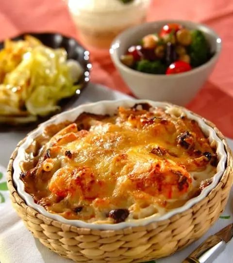 グラタンをメインに食後には桃缶を使ったデザート! 思わず笑顔がこぼれるメニューです♪
