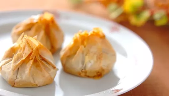 表面に溶かしバターをぬり、グラニュー糖を振ってまぶす。180℃に予熱しておいたオーブンで15~20分ほど焼く。パートフィロはすぐに乾燥するので使う直前までラップで覆っておく。パートフィロは製菓材料店で手に入りますが、手に入らない場合は春巻きの皮で代用可。