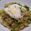 (1)を加えて炒め合わせ、器に盛り分けて白ゴマ、細ネギを散らし、器の中央に温泉卵を割り入れる。