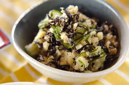 (1)のジャガイモに(2)とキュウリを加えて混ぜ合わせ、さらにマヨネーズを加えて混ぜ合わせ、器に盛る。
