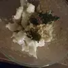 里芋は上下の皮を切り落とし、ラップに包んで電子レンジで柔らかくなるまで加熱し、皮をむいて、フォークなどで粗くつぶす。