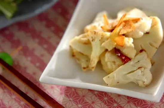 (1)のフライパンでカリフラワーを炒め、赤唐辛子を入れる。塩と粗びき黒コショウを振る。皿に盛り、(1)で取り出したニンニクを散らす。