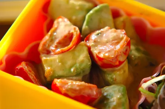 アボカドは皮と種を取り除き、食べやすい大きさに切る。プチトマトはヘタを取って水で洗い、縦半分に切る。ボウルに<ドレッシング>の材料を混ぜ合わせておく。