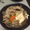 <調味料>、豆腐を加え、2~3分位煮て火を止め、最後にすりおろしたショウガを加える。