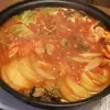 鶏肉とキャベツ、玉ネギ、エリンギがたっぷり入った、カレー粉入りのトマト鍋。身体が温まりますよ。