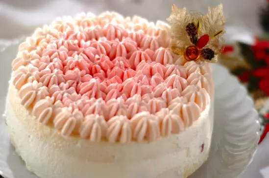 残った生クリームを8分立てにし、食紅を少々入れて星形の口金を付けた絞り袋に入れる。ケーキの外側から中心へグラデーションになるように少しずつ食紅を足しながら絞る。