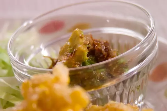 アボカドは果肉を取り出し、食べやすい大きさに崩す。かつお節、<合わせじょうゆ>と混ぜ合わせ、器に盛る。