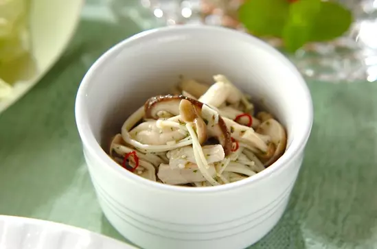 <ゆでるお湯>の材料を鍋に入れて強火にかけ、煮たってきたらキノコをサッとゆでてザルに上げる。ゆで汁をきり、<マリネ液>のボウルに加えて混ぜ合わせる。食べる直前まで冷やしておき、器に盛る。(ヒント)30分以上漬けておくと味がなじんでおいしいです。調理時間に漬ける時間は含まれていません。