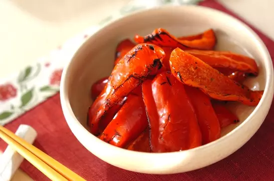 網で焼いた赤ピーマンは皮が柔らかく、甘さが凝縮!和風の酢の物でとてもさっぱりといただけます!