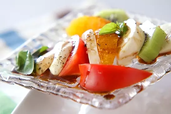 器にモッツァレラチーズ、トマト、キウイ、オレンジを盛り合わせ、バジルの葉を飾る。