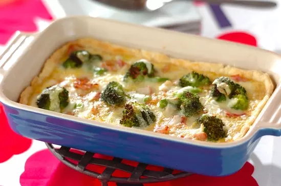 いったんオーブンから取り出し、ベーコン、玉ネギ、ブロッコリーを(5)に並べ、<キッシュ液>を流し込み、ピザ用チーズをのせ、170℃のオーブンで15分焼く。