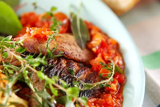器にサンマと、<トマトソース>を盛りハーブを飾る。