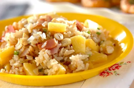 塩コショウで味を調え、パイナップルを加える。最後にしょうゆを中華鍋の鍋肌に添わせて加え、カシューナッツを加えて軽く混ぜ合わせ、器に盛る。お好みで分量外の粗びき黒コショウを振って下さい。
