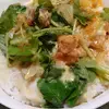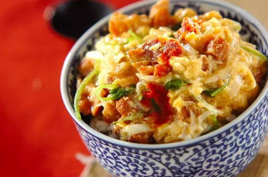 溶き卵、ミツバを加え、卵が半熟状にかたまってきたら、火を止める。ご飯をよそった器にかけ、一味唐辛子を振る。