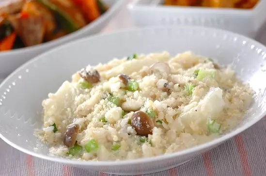 カブが柔らかくなったら炊き立てご飯、カブの葉、シメジを加えてひと煮立ちさせる。