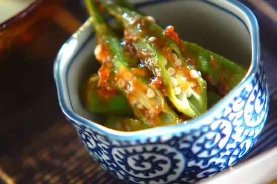 <合わせ梅肉>のボウルにオクラを加えて和え、器に盛る。