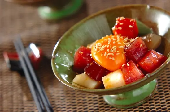 ボウルに<タレ>の材料を入れて混ぜ、イカとマグロを加えて混ぜ合わせる。器に盛って卵黄をのせ、白ゴマを振る。