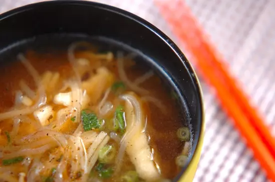 鍋にだし汁を入れ中火にかけ、煮立ったら糸コンニャク、油揚げを入れる。再び煮立ったらエノキを加えてみそを溶き入れる。