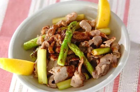 フライパンにオリーブ油を入れて強火で熱し、豚肉を炒める。肉の色が変わったらグリーンアスパラを加えて炒め合わせ、しんなりしてきたら器に盛る。