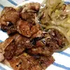 玉ねぎも一緒にソテーし、焼き色をつけるために肉に薄く小麦粉をはたきました。バルサミコと醤油の風味が効いておいしくいただけました。