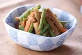熱湯にサヤインゲン、新ゴボウ、ニンジンを入れてゆで、ザルに上げてしっかり水気を切る。
