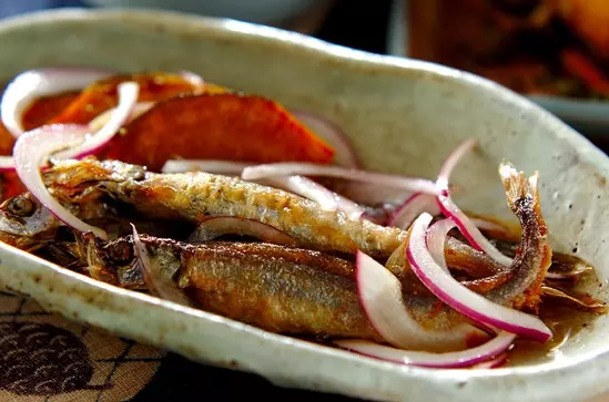 シシャモとカボチャは揚げたてをマリネ液に漬けるのがポイントです。