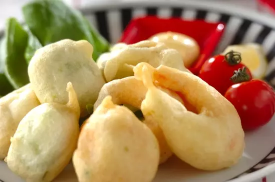 エビとアボカドを<衣>によくからめて、160℃の揚げ油で、ふっくらと濃い揚げ色がつかないように揚げ、油をきる。