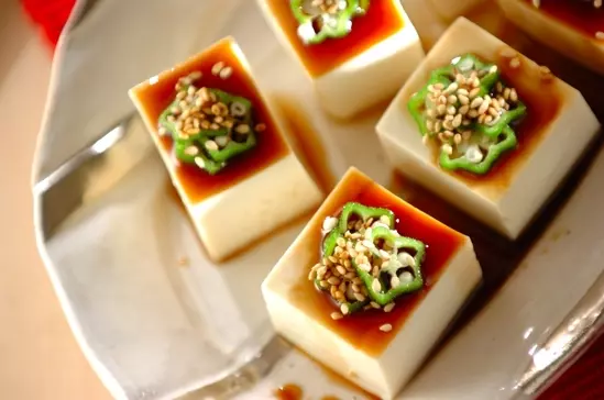 豆腐をひと口大に切り、オクラをのせ白ゴマをふる。<自家製出汁じょうゆ>を回しかける。