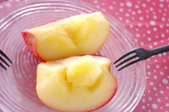 耐熱容器にリンゴを重ならないようにおき、砂糖、塩をまんべんなくまぶし、白ワインを掛けてラップをし、電子レンジに2~3分かける。電子レンジは600Wを使用しています。