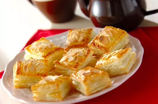 オーブンシートを敷いた天板にパイシートを半量並べ、板チョコレートを置き、イチゴシャムを少量ぬる。(1)の<卵黄水>を四辺にぬって残りのパイシートをかぶせ、フォークで押さえて止め、表面にも<卵黄水>を薄くぬり、スライスアーモンドをのせる。