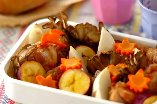鶏肉をもみ込んだり、天板に材料を並べるのをお子さんと一緒に♪ ニンジンはお好みの型でどうぞ!