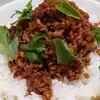<調味料>を加え、煮汁が少なくなるまで炒める。ご飯を丼によそってそぼろをのせ、大葉(または香菜)を散らす。
