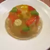 レシピのコンソメゼリーに、黄色パプリカ以外にも赤色パプリカやヤングコーン、枝豆など具材をいろいろ増やして固めてみました!ゼリーの味もちょうどよく、見た目も可愛く出来ました!